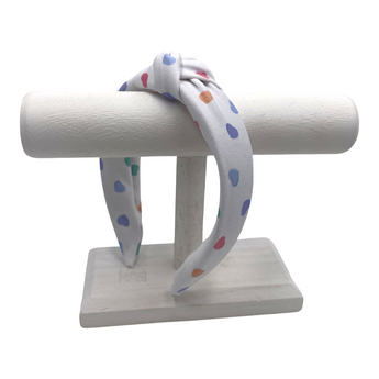 Material: Soft, pliable fabric-covered headband. Headband is approximately 1.5 inches at the widest part.